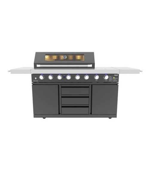 - This grill is equipped with 3 generous roller storage drawers and dual side cabinets, one for your gas bottle with a convenient slide out tray and the other with a shelf that makes it perfect for storing all of your cooking essentials