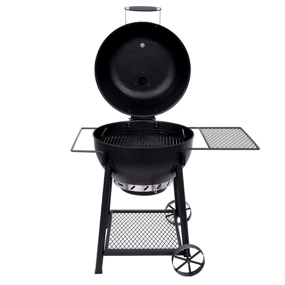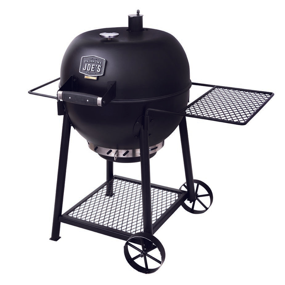 The Oklahoma Joe’s® Blackjack Kettle Charcoal Grill delivers charcoal grilling performance like no other with innovative features, rugged style and durability. The fire bowl and lid are porcelain-coated for superior durability and rust resistance. An adjustable smokestack and 360° air intake deliver reliable temperature control and even fuel burn. Cleanup is simpler than ever with a porcelain-coated cooking grate and removable ash pan, and the hinged lid lets you easily check on your food and fuel. A large side shelf provides ample space for food prep and serving, while the towel bar keeps grilling tools and towels handy. Both the shelf and the towel bar can be swapped out for a second shelf or towel bar (sold separately).